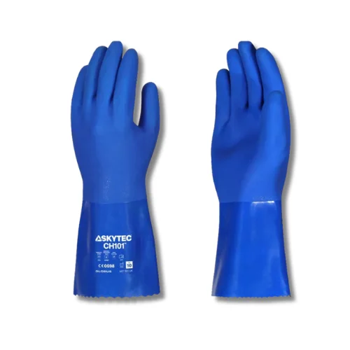 Guminės darbo pirštinės SKYTEC CH101 pilnai aplietos PVC sluoksniu. Itin lanksti ir minkšta PVC danga su grublėtu paviršiumi užtikrina puikų sukibimą riebiose ir drėgnose aplinkose. Pirštinės puikiai apsaugo nuo įvairių skysčių, tepalų, alyvos ir kitų teršalų. Besiūlis medvilninis pamušalas suteikia didesnį komfortą ir efektyviau sugeria prakaitą. Pirštinės pasižymi aukščiausiu atsparumu dilimui. Jos puikiai tinka automobilių, statybos, naftos, chemijos pramonėse bei žemės ūkyje. Galimas tiesioginis kontaktas su maistu.