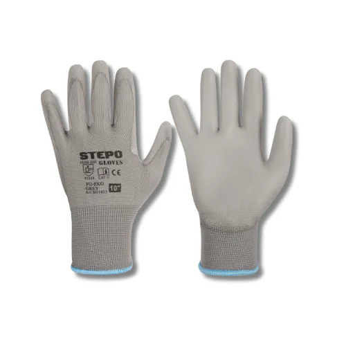 Darbinės pirštinės iš poliesterio STEPO PU-EKO GREY, aplietos poliuretanu. Puikiai priglunda prie rankos, patogu suimti net ir labai smulkius daiktus. Poliuretanas išgarina drėgmę, todėl rankos mažiau prakaituoja.