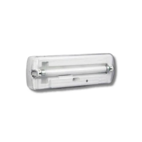 Naujo dizaino, avarinio išėjimo šviestuvas, korpusas polikarbonato, baltos spalvos, komplekte rezervinio maitinimo akumuliatorius (Ni-Cd-2,4 V-1,5 Ah), mygtukas šviestuvo testavimui, liuminiscencinė lemputė, 220 V, Graikija.